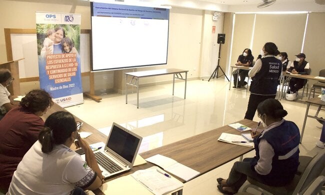 Madre De Dios, Agosto de 2022.-Con el objetivo de realizar un trabajo conjunto con el personal especializado de diferentes áreas y evaluar los principales riesgos de la región, la Dirección Regional de Salud con el apoyo técnico de la Organización Panamericana de la Salud (OPS/OMS) y la cooperación financiera de BHA/ (USAID); realizó con éxito el Taller de Evaluación star e índice de preparativos ante emergencias y desastres en Salud en Madre De Dios.