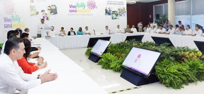 Mérida, 21-23 de marzo.- El Gobernador de Yucatán, Lic. Rolando Zapata Bello, inauguró oficialmente la campaña "Vive feliz, vive sanamente", por una buena salud mental, y así se dio inicio al taller para la elaboración del "Plan estratégico de prevención y manejo del suicidio" del Estado. La Oficina de la OPS/OMS en México estuvo representada por el Dr. Enrique Gil. De acuerdo a cifras del Sistema Estatal de Defunciones, el suicidio en Yucatán se ha incrementado significativamente durante los últimos 13 años.