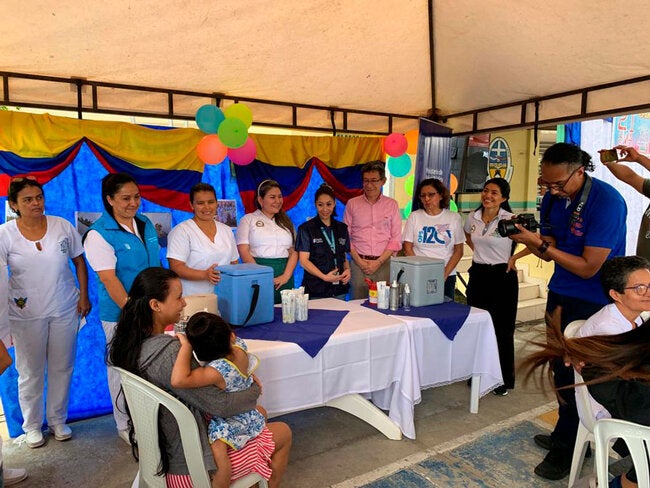 En el acto de inicio de la Semana de Vacunación de las Américas participaron el viceministro de salud pública de Colombia, Jaime Urrego; la viceministra de gobernanza de la salud de Ecuador, Gabriela Aguinaga; los representantes de la OPS Colombia, Gina Tambini Goméz, y de Ecuador, Óscar Barreneche; la secretaria de salud de Putumayo, Adriana Lucía Médicis; el alcalde de Puerto Asís, José Fernando Castillo y la secretaria de salud municipal, Janeth Botina; así como representantes de las autoridades indígenas y de las comunidades afro.