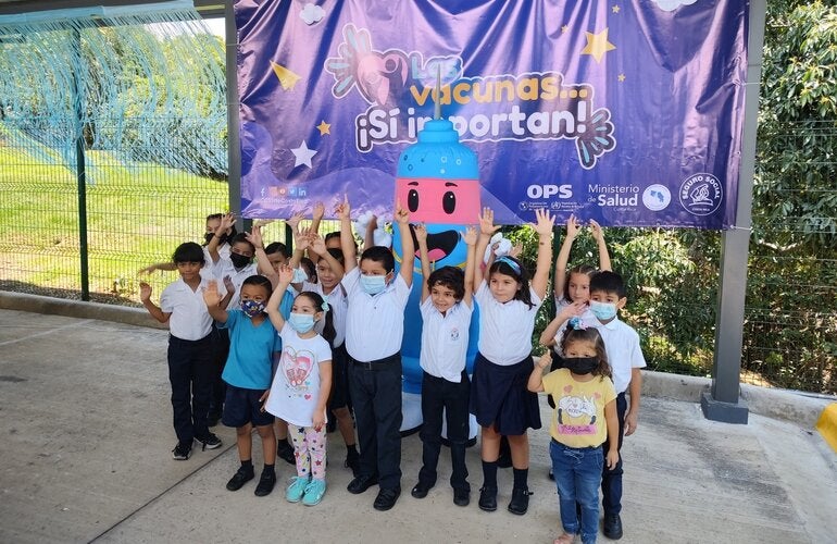 San José, 24 de abril de 2023. Niños y niñas de diversas edades del centro educativo Juan Mora Fernández, en Santa Bárbara (Heredia) celebraron, junto con los equipos vacunadores, el inicio de la Semana de Vacunación en las Américas y lo hicieron de la mejor manera: completando su esquema básico de vacunación.