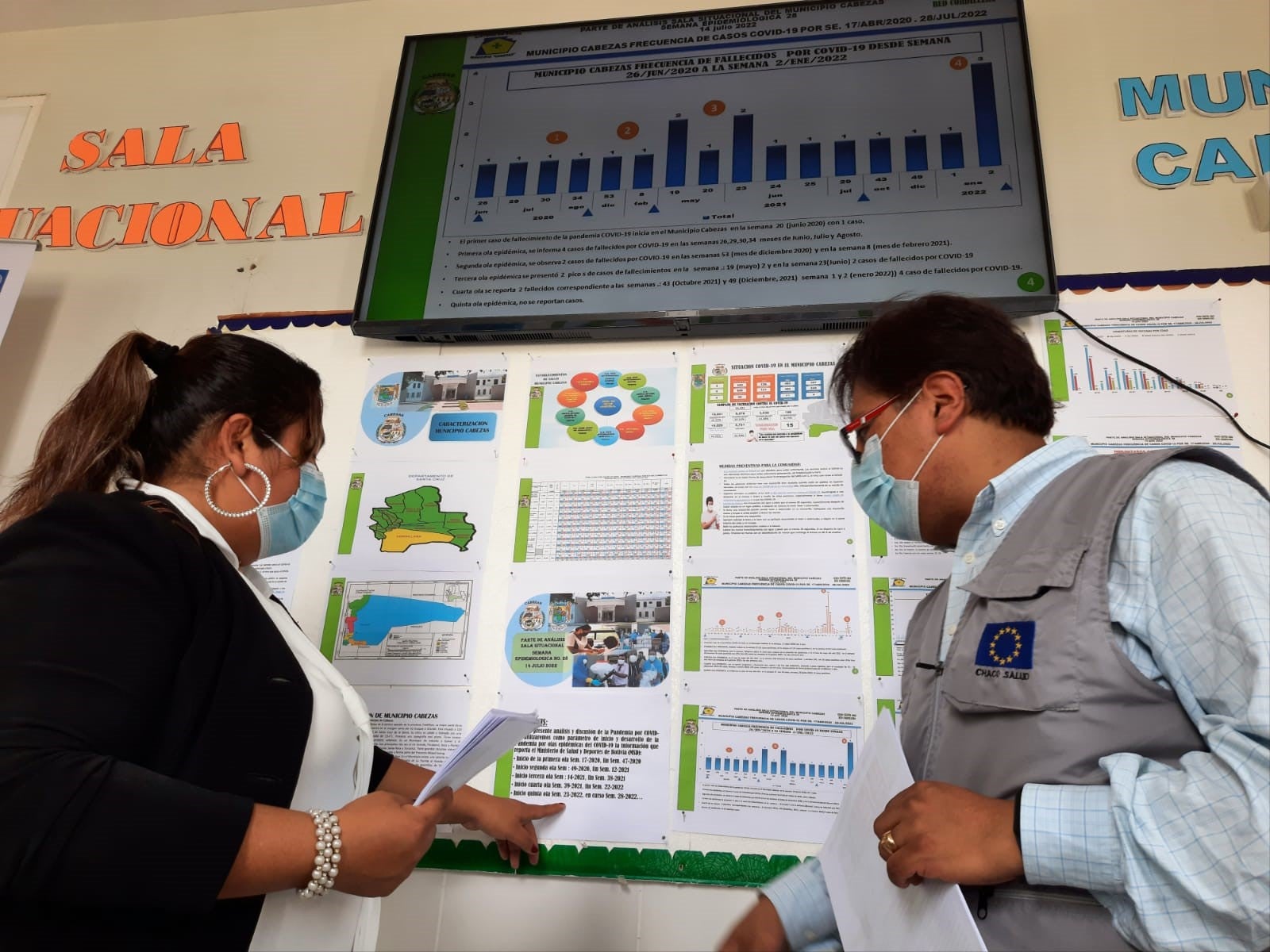 Charagua Iyambae, 25 de julio de 2022 (OPS)- Se instalan salas situacionales de vigilancia epidemiológica en establecimientos de salud del Chaco cruceño. Se trata de una sala técnica de análisis epidemiológico de COVID-19, cuya función principal es transmitir información clara y sistematizada al personal de salud y a las autoridades para fortalecer la toma de decisiones sobre la gestión y respuesta a la emergencia sanitaria por la pandemia. Este componente esencial para la vigilancia epidemiológica de COVID-19 fue posible gracias al proyecto ECHO Chaco, financiado por la Unión Europea, y ejecutado de manera conjunta entre la Organización Panamericana de la Salud (OPS), el Programa de las Naciones Unidas para el Desarrollo (PNUD) y Plan Internacional (PI).