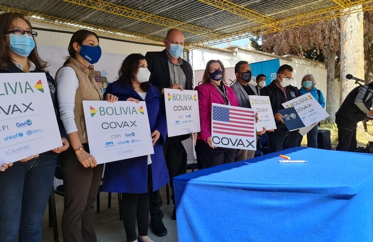 Bolivia forma parte de los países de Compromiso de Mercado Anticipado (AMC) de COVAX, mediante el cual las dosis enviadas por el mecanismo son financiadas por donantes públicos y privados como Asistencia Oficial al Desarrollo (ODA), y, por lo tanto, no tienen costo directo para el país. El Fondo Rotatorio de la OPS, que históricamente ha manejado la compra de vacunas para la región, es también el mecanismo designado para distribuir las vacunas contra COVID-19 para los países de las Américas ante la iniciativa COVAX, contribuyendo a que Bolivia plasme lo que es la mayor operación de adquisición y suministro de vacunas de la historia del país.