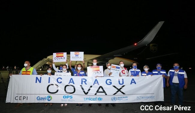 Managua, 26 de septiembre de 2021 (OPS/OMS) — Nicaragua recibió esta madrugada 499,200 dosis de vacunas contra la COVID-19 donadas por España, lo que evidencia el compromiso de los países que disponen de este biológico y lo comparten para el bienestar de la población que aún no ha sido vacunada. Esta donación se ha canalizado a través del Mecanismo COVAX en coordinación con el Fondo Rotatorio de la OPS, la que contribuirá a aumentar la cobertura vacunal y por consiguiente reducir la mortalidad, así como las hospitalizaciones.