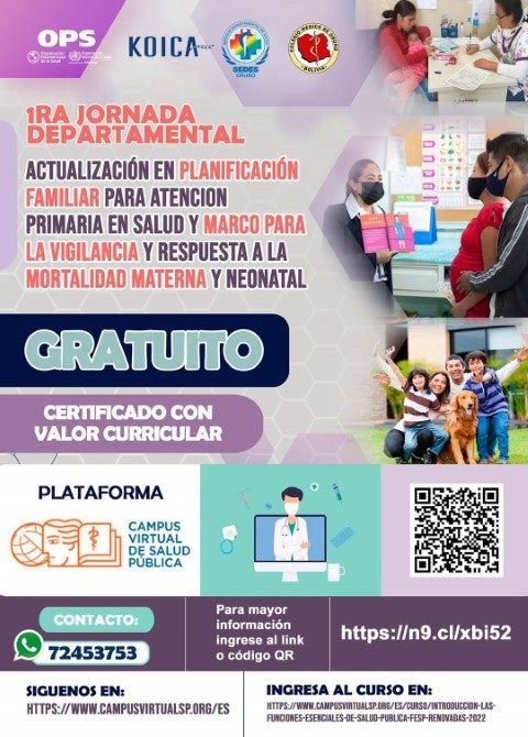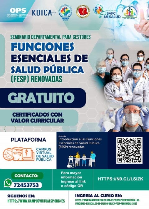 Los cursos virtuales que se realizan en la gestión 2022 son promovidas en el marco del proyecto “Mejora del estado y la calidad de vida en el altiplano Oruro, Bolivia” (PROMESA) que se implementa en las redes de servicio de salud urbana de Oruro y cuenca Poopó, con la contribución financiera de la Agencia de Cooperación Internacional de Corea (KOICA) y LA cooperación técnica de la Organización Panamericana de la Salud/ Organización Mundial de la Salud (OPS/OMS), en coordinación con el Ministerio de Salud y Deportes.