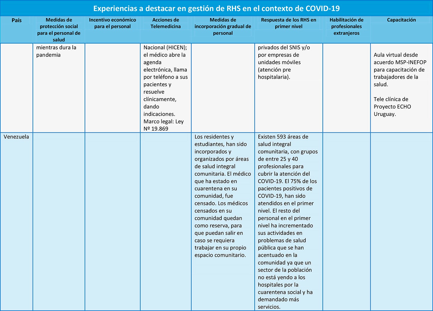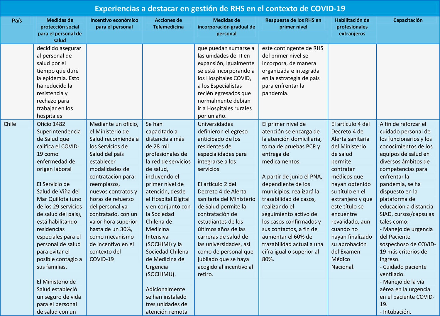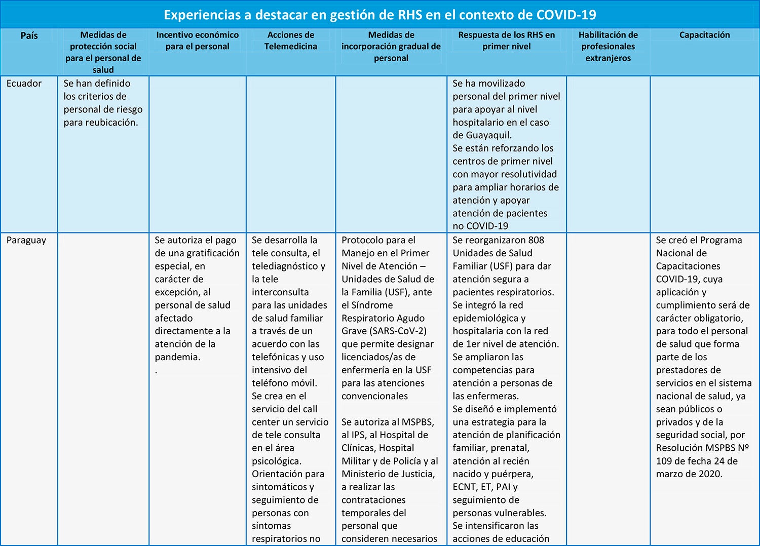 La recopilación de estas experiencias ha sido posible gracias a un fructífero diálogo y un enriquecedor proceso de intercambio de experiencias con los asesores de Sistemas y Servicios de Salud y Recursos Humanos, de las oficinas de OPS en América del Sur. Nuestro agradecimiento al aporte que han hecho y a la información entregada. Desde el Programa Subregional para América del Sur de la OPS, nos mantenemos disponibles para seguir promoviendo el diálogo y el intercambio de experiencias que apoyen nuestra cooperación técnica en esta crisis.