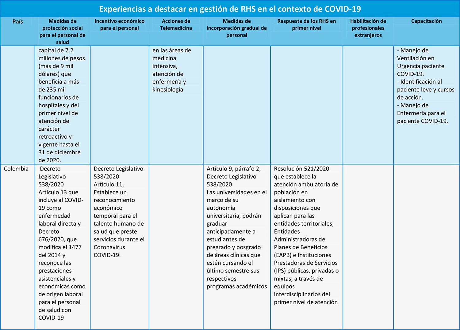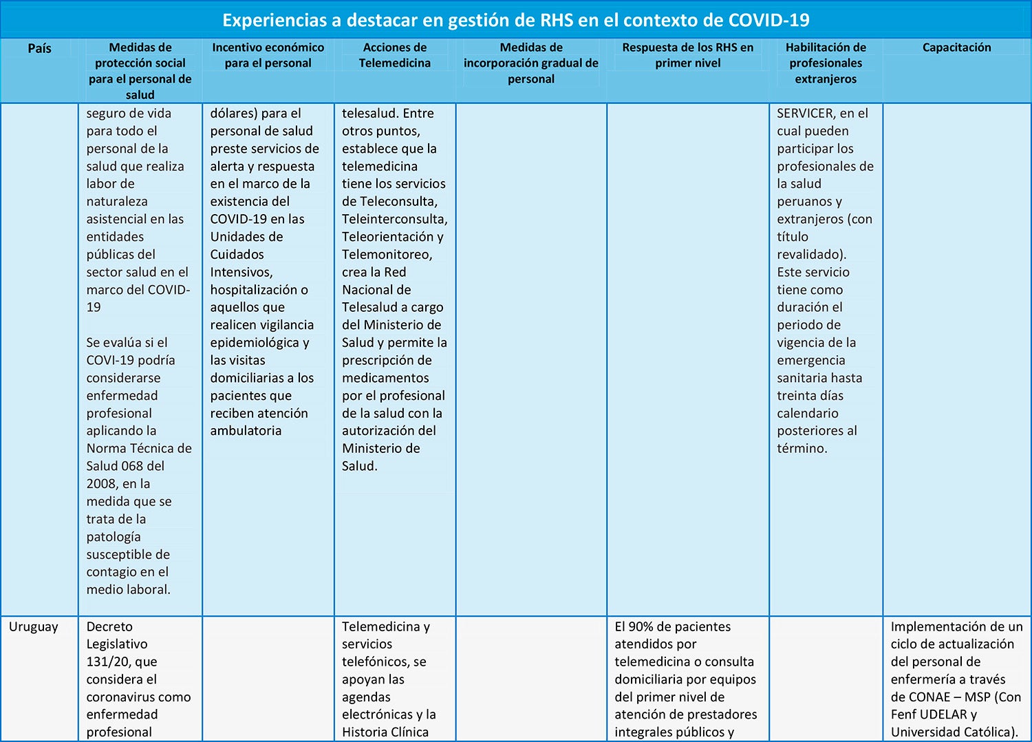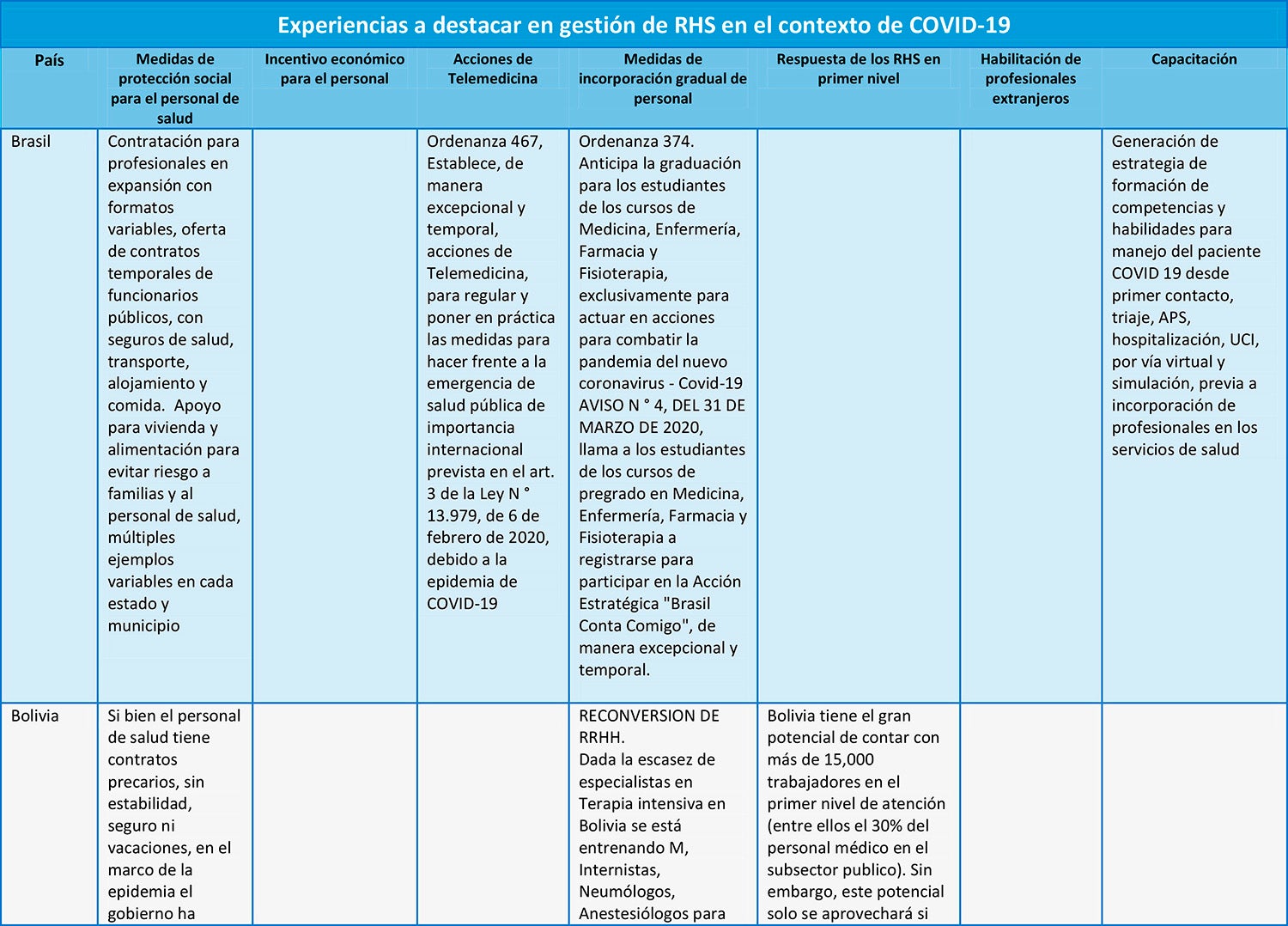 La recopilación de estas experiencias ha sido posible gracias a un fructífero diálogo y un enriquecedor proceso de intercambio de experiencias con los asesores de Sistemas y Servicios de Salud y Recursos Humanos, de las oficinas de OPS en América del Sur. Nuestro agradecimiento al aporte que han hecho y a la información entregada. Desde el Programa Subregional para América del Sur de la OPS, nos mantenemos disponibles para seguir promoviendo el diálogo y el intercambio de experiencias que apoyen nuestra cooperación técnica en esta crisis.