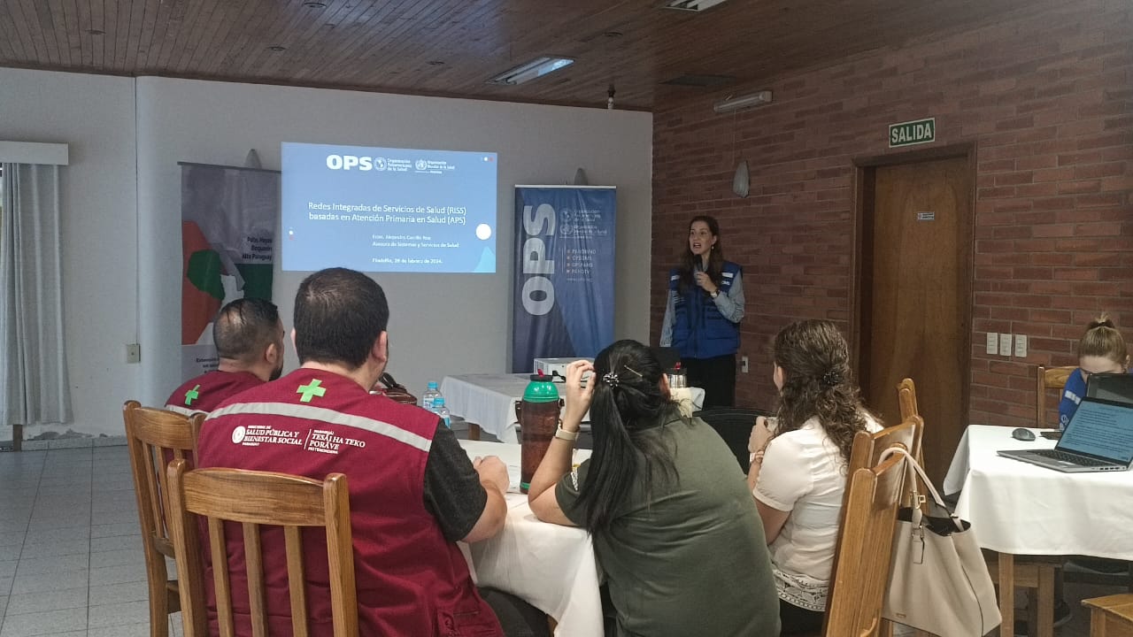 La Asesora de HSS de la OPS/OMS, Econ. Alejandra Carrillo, realizó la presentación de las Redes Integradas de Servicios de Salud (RISS) basadas en la Atención Primaria en Salud (APS), resaltando la importancia del acceso a la salud de la población a través de la APS y mostrando abordajes para la actualización de la organización, funcionamiento y recategorización de las microrredes para garantizar la continuidad del cuidado. Seguidamente, la XVI Región Sanitaria de Boquerón expuso la composición de sus microrredes, resaltando aquellas priorizadas en el Proyecto que son la microrred de Mariscal Estigarribia y la microrred de Boquerón. Así también, en ese contexto se pudo dialogar entre los presentes sobre las necesidades y prioridades para el fortalecimiento de dichas microrredes, entre las que se enfatizaron las brechas de recursos humanos calificados y capacitados, sangre segura, sistemas de información, laboratorio, recategorización de establecimientos de salud, agua segura y energía eléctrica, referencia y contrarreferencia, entre otros.