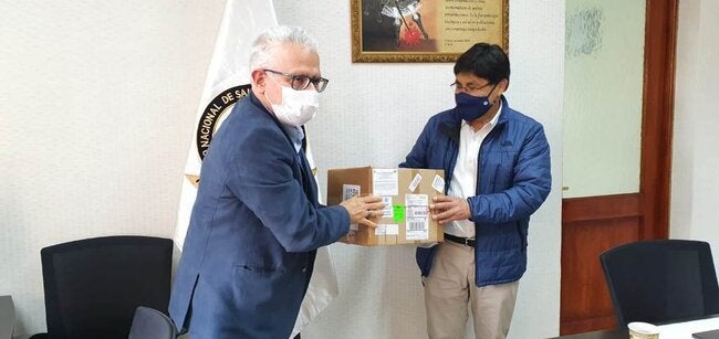 Lima, 29 de octubre de 2020.- El Dr. Rubén Mayorga-Sagastume, representante de OPS/OMS en Perú entregó en calidad de donación, 2mil 500 pruebas para la detección de antígenos de COVID-19 al Jefe del Instituto Nacional de Salud (INS), Dr. César Cabezas Sánchez.