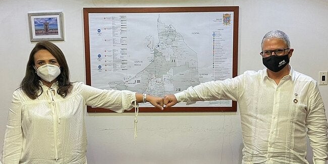 Campeche, Campeche, 28 de septiembre de 2021 - el Representante de OPS/OMS se reunió con la nueva titular de Salud de Campeche, Liliana Montejo; se discutieron diversas líneas de colaboración conjunta, destacando el potencial de un acompañamiento de OPS en la implementación de la estrategia comunitaria de prevención, mitigación y atención a la COVID-19 con enfoque de APS cuyas líneas generales de organización y protocolos de actuación consideran tres diferentes grupos de acción comunitaria vinculados e integrados con el primer nivel de atención: brigadas comunitarias de promoción de la salud, brigadas especializadas y equipo de atención clínica de unidades de salud del primer nivel de atención, que se coordinan entre sí, para implementar acciones con distintos niveles de especificidad y de cobertura; cabe señalar que esta estrategia se adapta en el nivel local, con base en sus características económicas, sociales, geográficas y de servicios de salud.