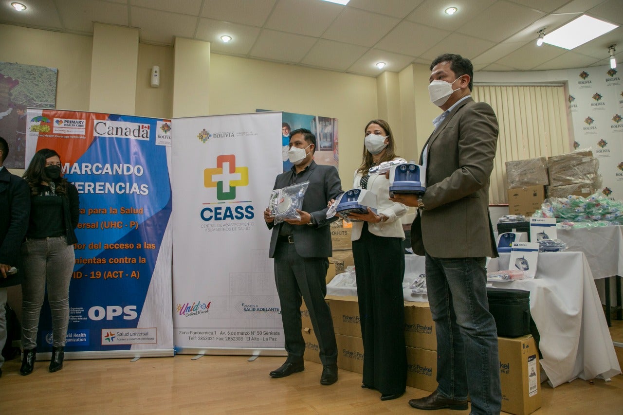 La Paz, 2 de diciembre de 2021 (OPS)- La Organización Panamericana de la Salud/Organización Mundial de la Salud (OPS/OMS) donó hoy al Ministerio de Salud y Deportes, con fondos del gobierno de Canadá, equipamiento de oxigenoterapia de alto flujo (OAF) para tratar a pacientes con curso moderado o severo de COVID 19. El donativo alcanza más de 206 mil dólares.