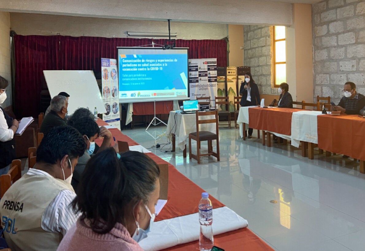 Moquegua, 23 de junio de 2022.- Periodistas y comunicadores institucionales de diversos medios y entidades de salud de la región Moquegua fueron convocados por la Dirección Regional de Salud (Diresa) con el objetivo de participar del taller “Comunicación de riesgos y experiencias de periodismo en salud asociadas a la vacunación contra la COVID-19”; con el fin de fortalecer los conocimientos y estrategias que vienen utilizando para informar y llamar a la acción a la población para completar su esquema de vacunación contra la COVID-19 y reducir temores en la población. Dicho evento fue parte del trabajo conjunto que viene realizando la Organización Panamericana de la Salud (OPS/OMS) en Perú, el Ministerio de Salud (Minsa) y la Dirección Regional de Salud Moquegua, con apoyo de USAID, en el marco del proyecto Plan de Rescate Americano.