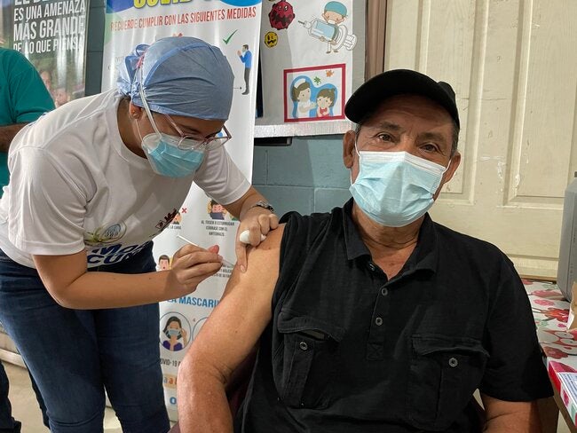 “Si vemos poca gente, salimos a llamar a la gente por todo el pueblo para que vengan a vacunarse” nos cuenta Antonio Orellana, quien junto a Oscar Gómez, Toño Contreras y Rafael Maldonado, son voluntarios para la promoción de la vacunación contra la COVID-19 en el municipio de Cofradía, Cortés. Comentan que de donde sea que los llamen ahí están ellos dispuestos a ayudar porque conocen la importancia de vacunarse y que las personas cuenten con la información correcta acerca de la vacuna contra la COVID-19.