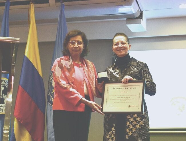 Blanca Llorente, directora de investigación de la Fundación Anáas, una organización colombiana de la sociedad civil cuya misión es generar conocimiento para promover el diseño e implementación de políticas públicas para la agenda 2030, recibió el premio del Día Mundial sin Tabaco 2023 que entrega la Organización Mundial de la Salud (OMS) por sus aportes en la lucha para el control del tabaco. Con su reconocimiento, Colombia se destacó entre los cinco países ganadores.