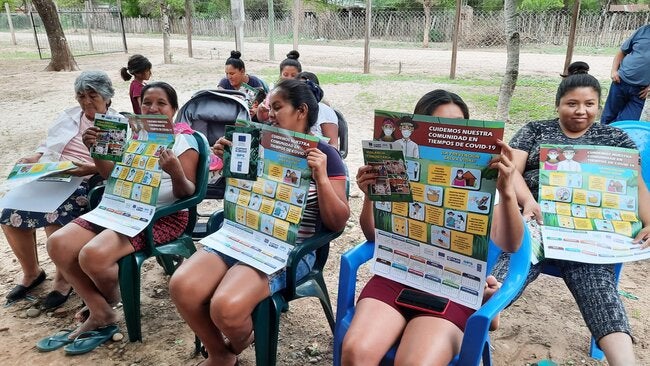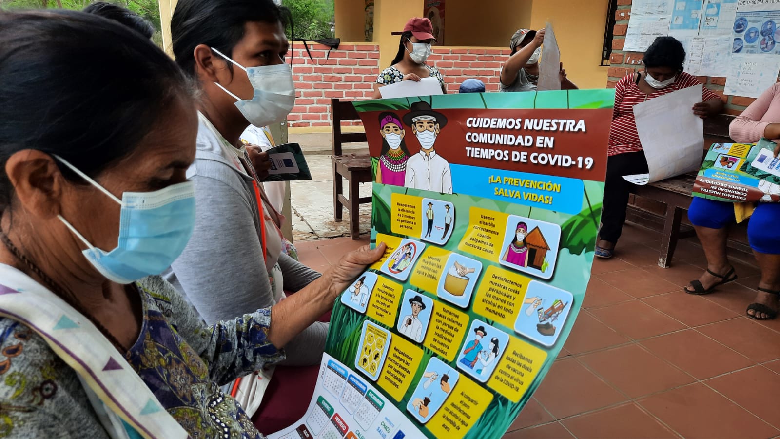 Cabezas, Camiri, Kereimba y Charagua Iyambae, 1 noviembre de 2022 (OPS).- Con el propósito de prevenir el incremento de casos positivos y fortalecer las acciones contra la COVID-19 en la provincia Cordillera, el proyecto Chaco Salud llegó hasta las comunidades de Salitralmi, Tatarenda Nuevo, Abapó Viejo, Parlamento, Los Pozos, Yateirenda, Palmarito, entre otros, para capacitar sobre la importancia de la vigilancia comunitaria y entregar material informativo para que los comunarios puedan compartir con sus autoridades y familiares.
