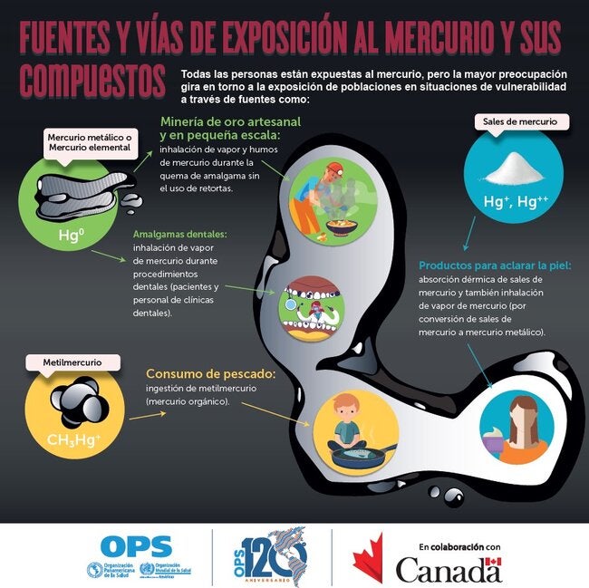 La Organización manifiesta que existen varias maneras de exponerse al mercurio y a sus diferentes compuestos: “por ejemplo, durante la quema de la amalgama en la minería de oro artesanal, el mercurio metálico en forma de vapor emitido en la atmosfera resulta en una exposición por inhalación. “Una vez en el organismo humano, a depender de las dosis y frecuencia de las exposiciones, el mercurio metálico puede causar daños respiratorios y neurológicos, afectación renal, cardiovascular y en el sistema inmune”.