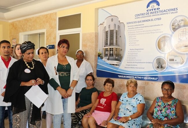 Como ya se señaló, una de las actividades desarrolladas fue la apertura de la Unidad de Desempeño Físico del CITED; espacio que a partir de ahora será de gran ayuda en la atención al proceso de envejecimiento en el país. Según comentó la Dra. Lilliam Rodríguez, directora del CITED, Cuba es hoy uno de los países más envejecidos de la región y para el 2025 será el más envejecido de América Latina y el Caribe. Ante esta situación, añadió Rodríguez, la respuesta desde la salud pública se basa en el replanteamiento de las acciones teniendo en cuenta las necesidades de las personas en esta etapa de la vida, tratando siempre de aprovechar la contribución que pueden hacer al desarrollo; y todas las iniciativas, independientemente de su tipo, deberán promover la capacidad funcional.