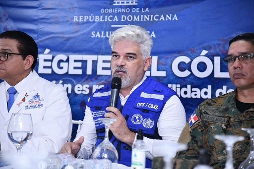 “La Organización está trabajando de la mano con el gobierno, para proteger la salud de la población y llevar a cabo acciones para mejorar la vida. Hizo donación de medicamentos, insumos básicos y apoyó en elaboración e impresión de materiales de comunicación de riesgo para cólera”, dijo el Asesor de Familia, Promoción de la Salud y Curso de Vida Organización Panamericana de la Salud, doctor Bernardino Vitoy durante una rueda de prensa donde acompañaba al ministro de Salud, doctor Daniel Rivera en la provincia Pedernales.