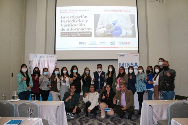 Lima, 7 de diciembre de 2022.- Los profesionales de periodismo y comunicación son aliados estratégicos de las entidades de salud pública dado que permiten que la población acceda a información veraz y oportuna para tomar decisiones que les permitan cuidarse y cuidar a su comunidad, promoviendo hábitos saludables y preventivos. Por eso, con la finalidad de fortalecer el abordaje adecuado de la información sobre la vacunación contra la COVID-19, la Organización Panamericana de la Salud (OPS) y las Direcciones de Redes Integradas de Salud (DIRIS) de Lima Centro y Lima Norte, realizaron un taller sobre verificación de información e investigación periodística.