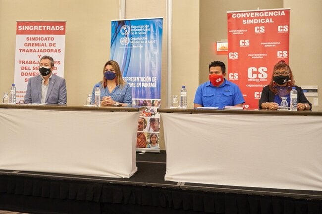 Panamá 07 de junio de 2021 (OPS) – Con el objetivo de facilitar la adquisición de conocimientos sobre el COVID-19 y cómo prevenirlo en ambientes laborales y comunitarios, la Organización Panamericana de la Salud / Organización Mundial de la Salud (OPS/OMS) en conjunto con el Sindicato Gremial de Trabajadoras y Trabajadores del Servicio Domésticos y Similares (SINGRTRADS) y la Federación Convergencia Sindical organizaron el “Taller de formación de multiplicadoras sobre las medidas de prevención del COVID-19 en ambientes laborales y comunitarios”, para capacitar a trabajadoras domésticas que integran esta organización sindical.