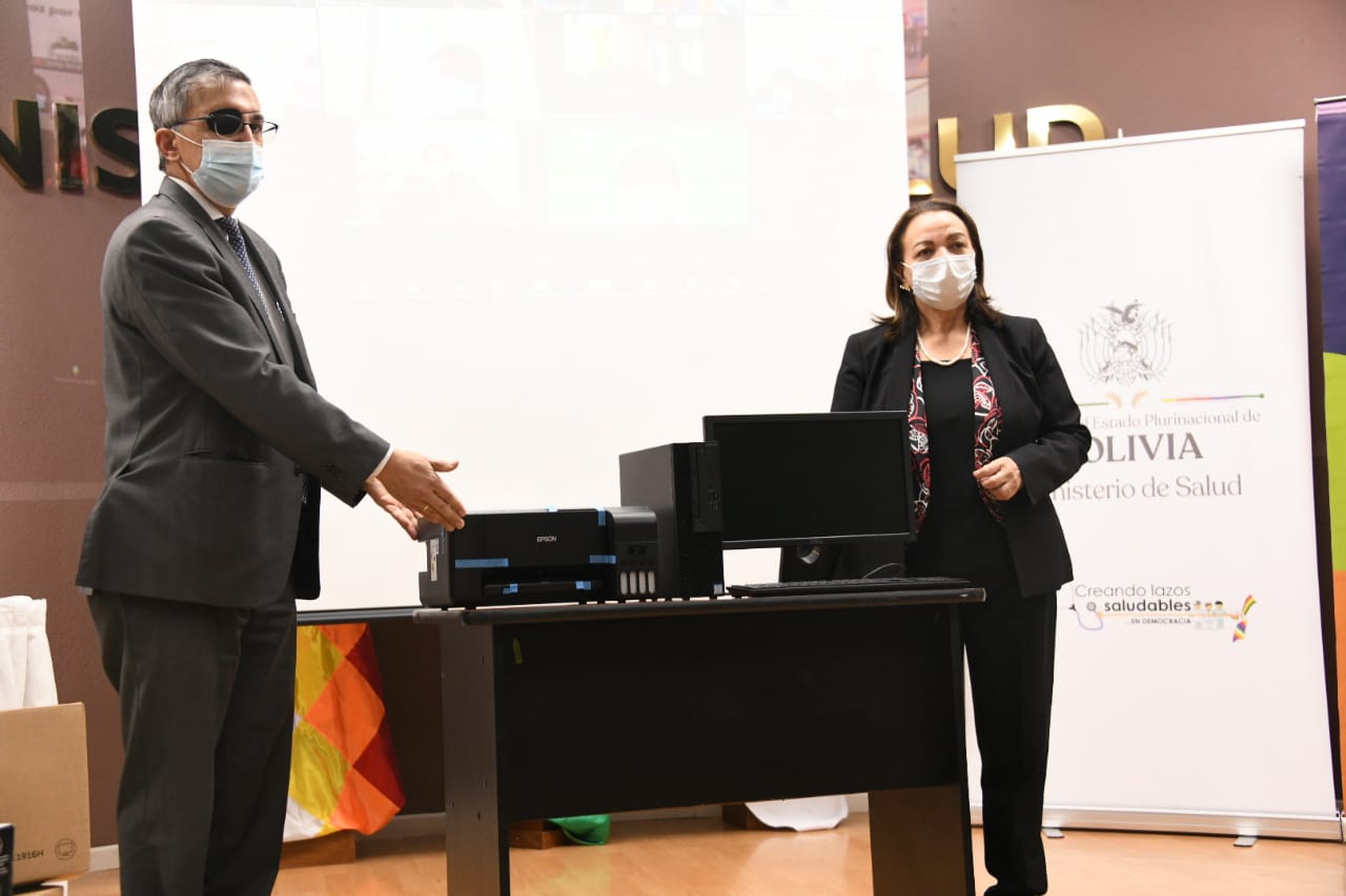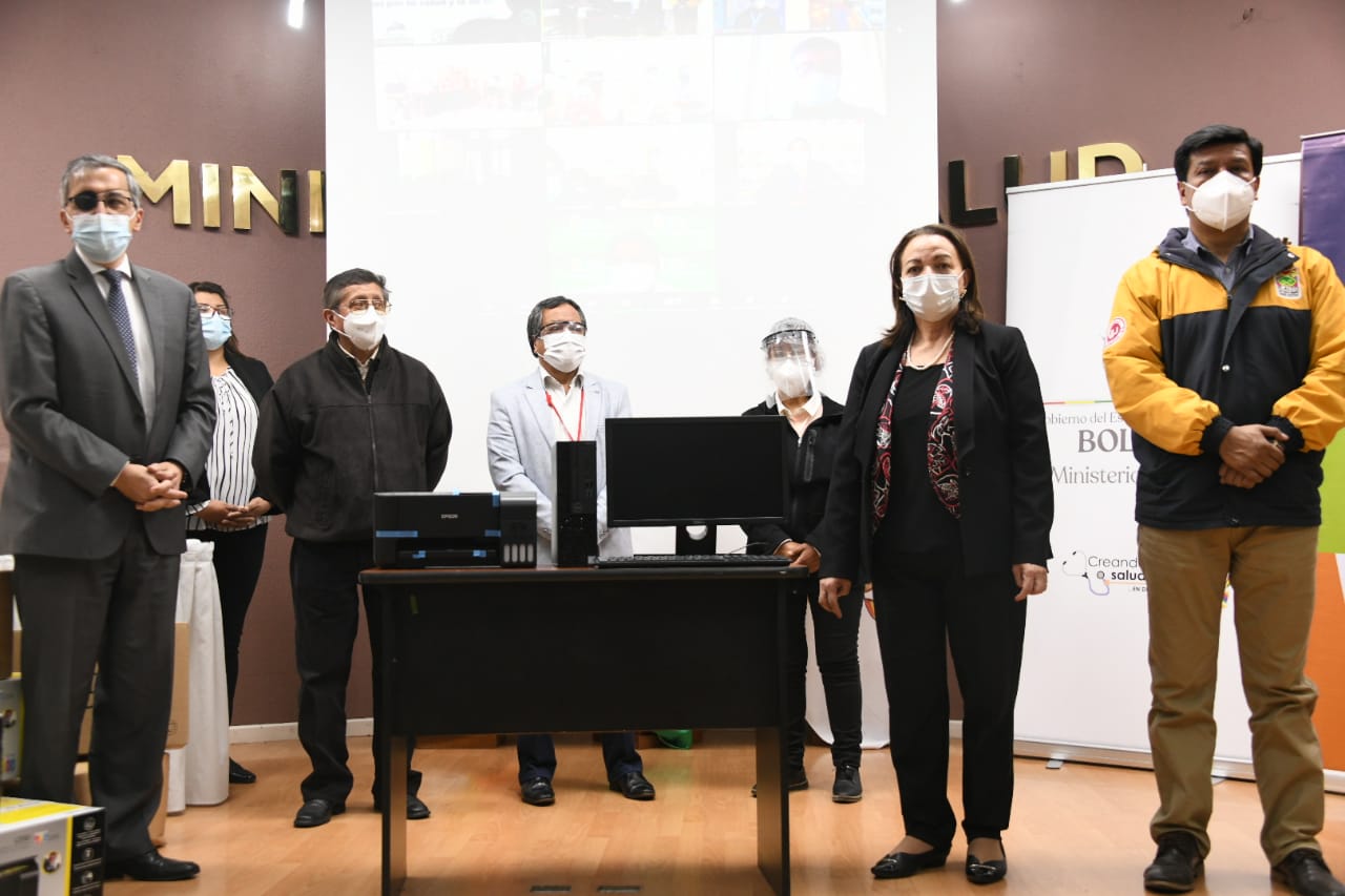 La Paz, 8 de octubre de 2020 (UNICOM MINSA/OPS/OMS)- Con el objetivo de avanzar en la cobertura universal de vacunación con esquemas completos y oportunos que impacten favorablemente en la población, el Ministerio de Salud entregó hoy 600 equipos informáticos para el registro nominal de vacunación electrónica (RNVe) del Programa Ampliado de Inmunización (PAI) a los nueve Servicios Departamentales del Salud del país y El Alto, beneficiando a más de 408 establecimientos de salud.