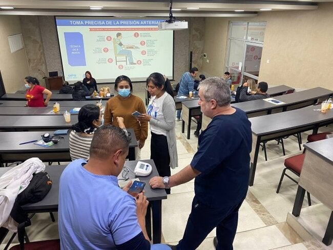 Santa Cruz de la Sierra, 5 de mayo de 2023 (OPS)- Ochenta jefes médicos centros de salud de primer nivel de la red urbana del departamento de Santa Cruz participaron del taller teórico-práctico de la toma precisa de la presión arterial, con el fin de fortalecer las competencias para mejorar el control de la hipertensión arterial y aumentar la exactitud de los diagnósticos.