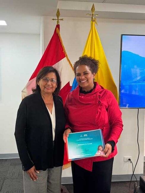 Durante el encuentro entre las delegaciones de la embajada de Canadá y la OPS Colombia, la representante de la OPS en el país, Gina Tambini Gómez, entregó a la embajada de Canadá el reconocimiento que otorgó el Ministerio de Salud y Protección Social a personas e instituciones que aportan al Plan de aceleración para la reducción de la mortalidad materna, en el marco del Día Mundial de la Salud, que este año se desarrolló bajo el lema "comienzos saludables, futuros esperanzadores".