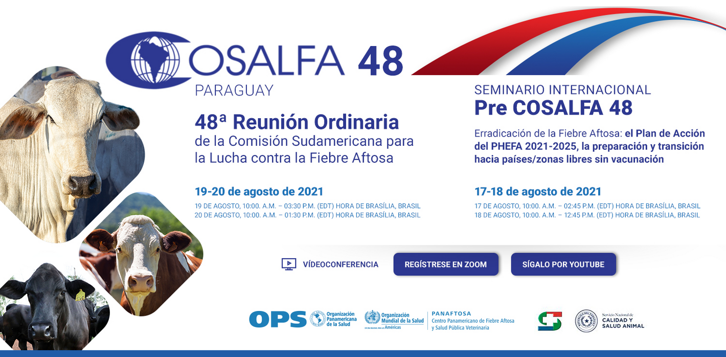 La pandemia actual por la COVID-19 y las restricciones de salud pública conexas aun nos impiden celebrar la 48ª Reunión Ordinaria de la Comisión Sudamericana de Lucha contra la Fiebre Aftosa (COSALFA) de manera presencial. En este contexto, el Director del Centro Panamericano de Fiebre Aftosa de la Organización Panamericana de Salud (PANAFTOSA/OPS) y el Director del Servicio Nacional de Calidad y Salud Animal (SENACSA), Paraguay, como país sede de la reunión, se reunieron y consideraron convocar la 48ª COSALFA para realizar de manera virtual en los días 19 y 20 de agosto del 2021.
