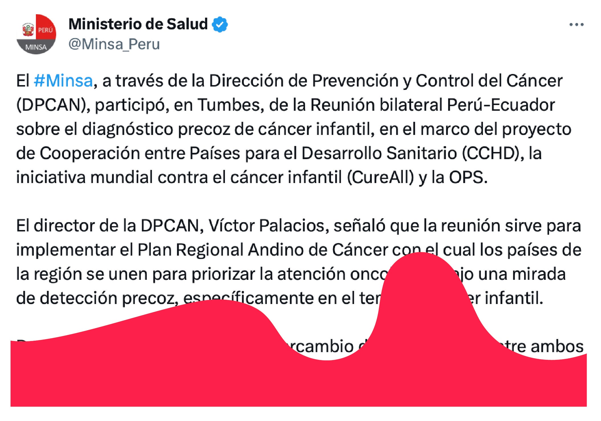 Se realizaron en el marco del proyecto, dos jornadas bilaterales. En septiembre del 2023, en la ciudad de Tumbes (Perú, en la frontera con Ecuador) se llevó a cabo el evento sobre la detección oportuna de cáncer infantil, dirigido a profesionales de la salud en zona de frontera. Participaron 100 profesionales de la salud y 60 promotores de salud de las zonas fronterizas de Perú, y 16 profesionales de la salud de Ecuador. Asimismo, en octubre del 2023, en la ciudad de Tacna (Perú, en la frontera con Chile) se llevó a cabo el evento sobre la detección oportuna de cáncer infantil, dirigido a profesionales de la salud en zona de frontera. Participaron 100 profesionales de salud y 50 promotores de salud de la zona de fronteras de Perú, y 13 profesionales de la salud de Chile.