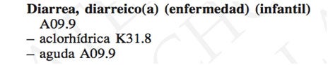 Podemos observar que el término aguda se localiza como un modificador esencial y el código que nos proporciona es: A09.9 (Gastroenteritis y colitis de origen no especificado).