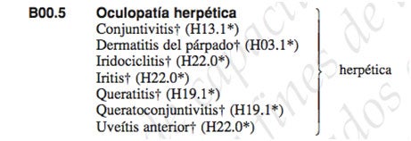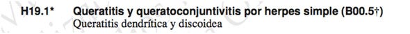 Observamos que la CIE-10 proporciona para este diagnóstico dos códigos: B00.5 que es un código de daga (†) y H19.1 que es un código de asterisco (*). El código de daga proporciona información sobre una enfermedad básica generalizada y el de asterisco sobre la manifestación de esa enfermedad en un órgano o en una localización en particular que por sí misma es un problema clínico.