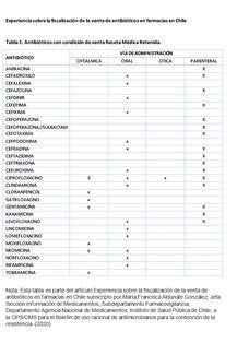 Actualmente, en Chile existen 29 antibióticos, cuya condición de venta es receta médica retenida, es decir, que debe ser archivarse en el establecimiento, que involucra formas farmacéuticas de uso parenteral, oral, oftálmico y ótico (ver tabla 1) (6). En una primera etapa, la fiscalización podría centrarse en estos medicamentos, ya que la evidencia de la receta archivada versus el número de ventas es objetiva y posible de implementar. Esto permitiría un diagnóstico que refleje el grado de cumplimiento de la condición de venta de los antibióticos, lo que podrá ampliarse, en una segunda etapa, a otros medicamentos antimicrobianos, tales como antivirales, antifúngicos y antiparasitarios.