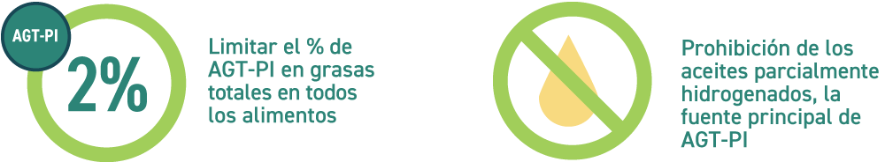 La eliminación de las grasas trans del suministro de alimentos se puede lograr a través de enfoques de políticas, incluido el uso de medidas legislativas o reglamentarias para limitar el contenido de AGT-PI a no más de 2 gramos por cada 100 gramos de grasas totales (es decir, 2%) en todos los alimentos, prohibir los aceites parcialmente hidrogenados, que son la fuente principal de AGT-PI; y / o una combinación de las dos políticas mencionadas anteriormente.