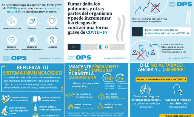 Esta es una serie de postales de redes sociales que explica como si se sufre de una enfermedad crónica o se consume tabaco el riesgo de contraer COVID-19 es mayor. Otras ofrecen consejo para mantenerse saludable frente a las ENTs durante la pandemia de COVID-19.