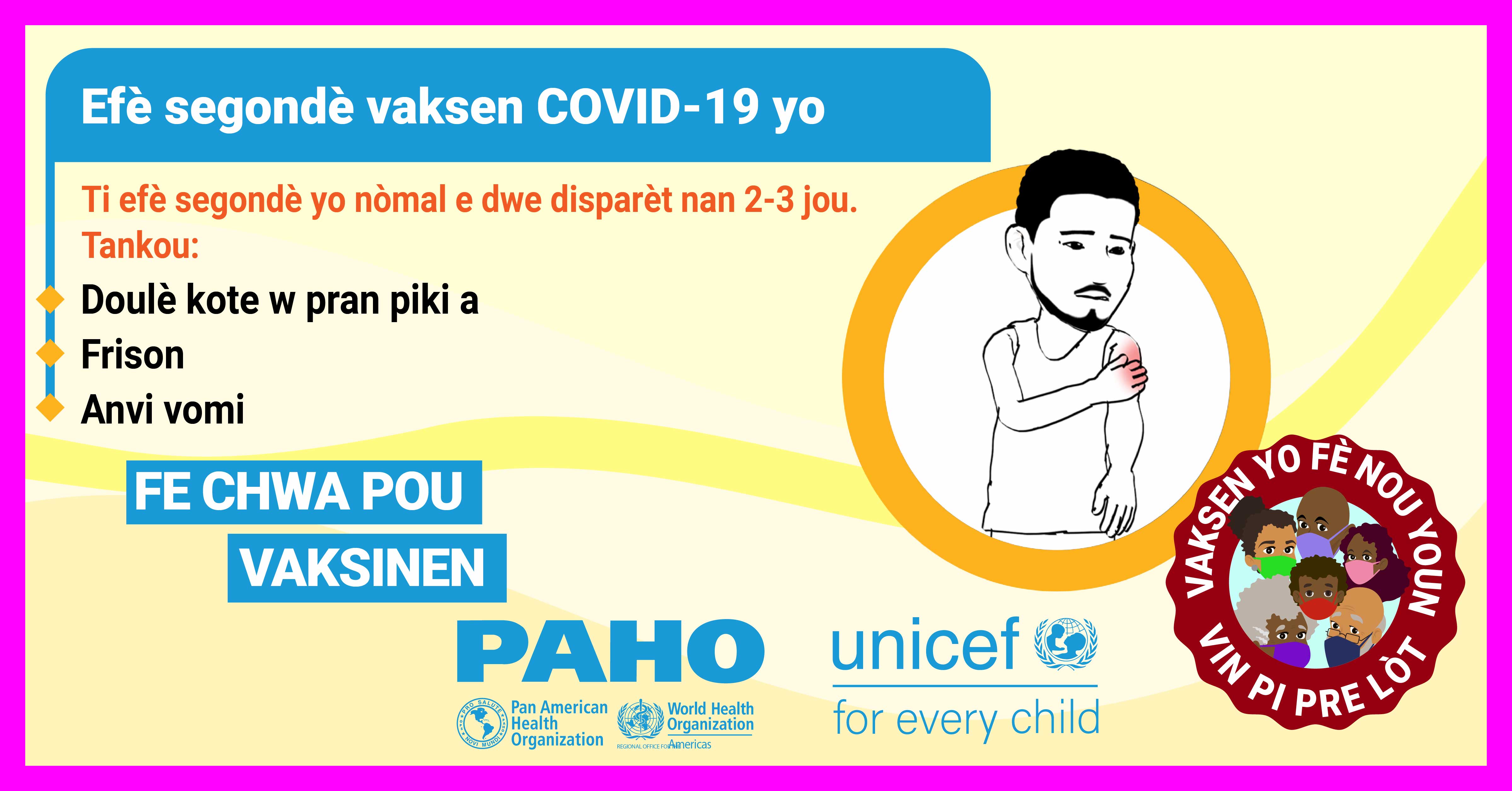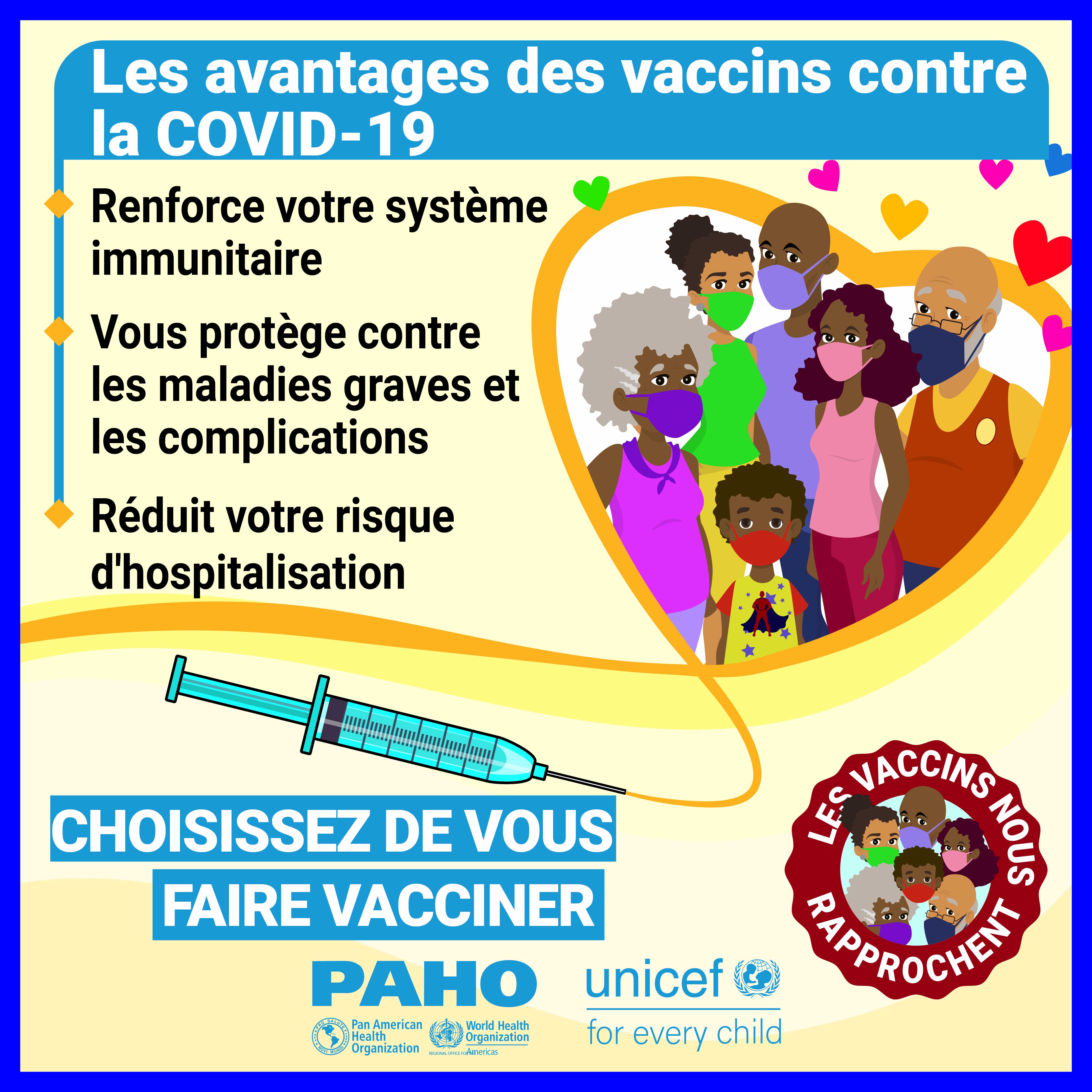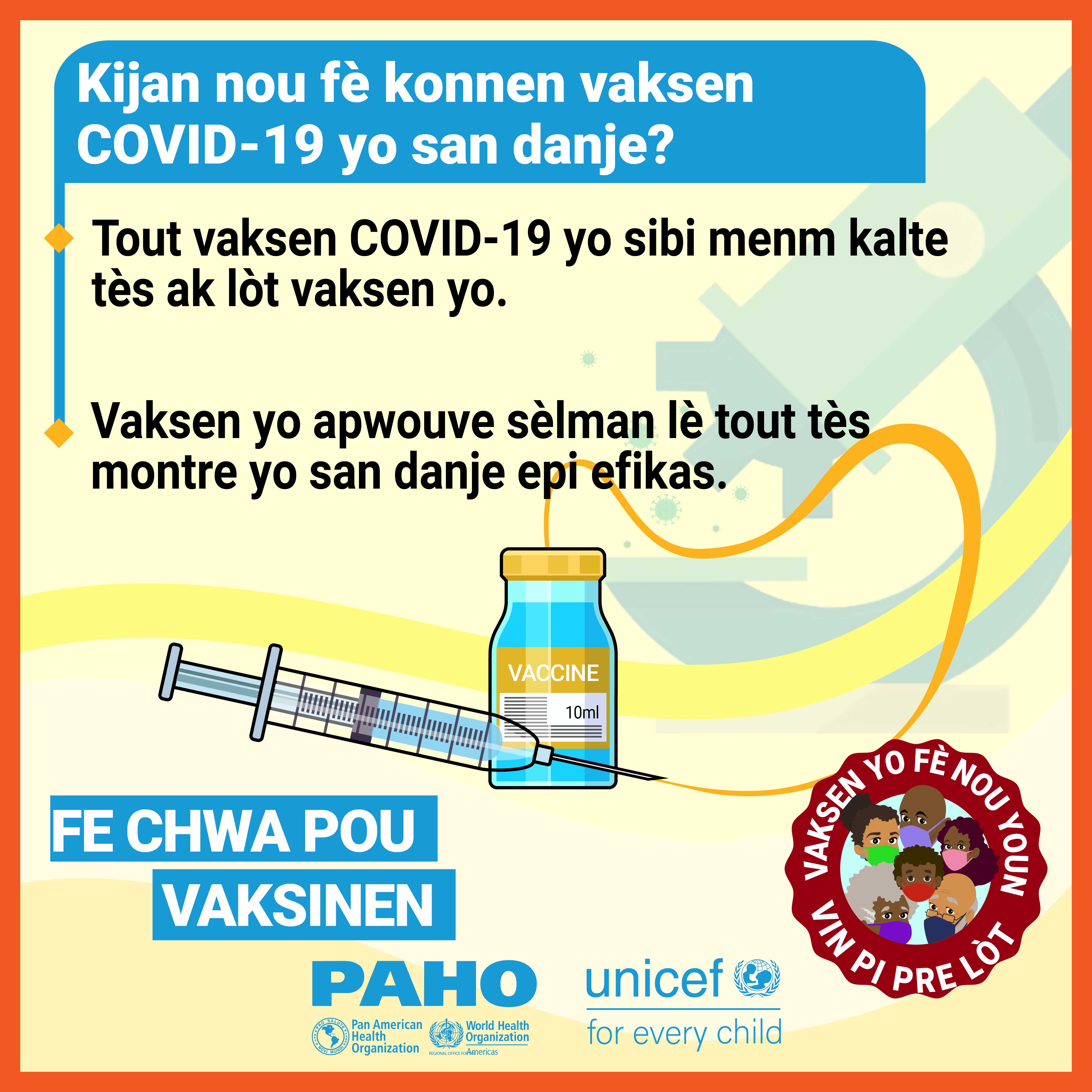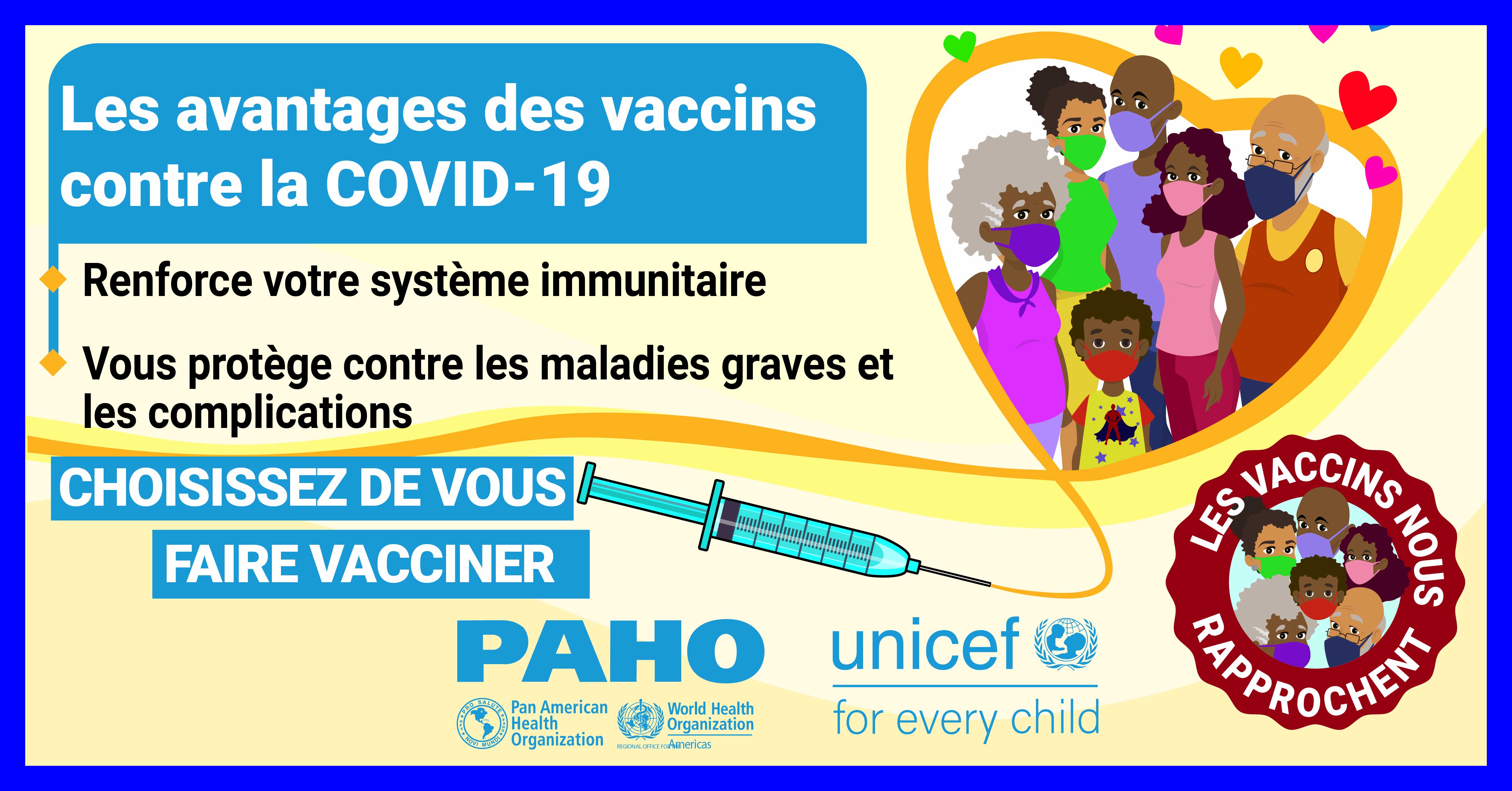 Dans la plupart des pays, les vaccins ne sont pas obligatoires et, par conséquent, la volonté du public de se faire vacciner contre le COVID-19 est une priorité élevée pour atteindre l'objectif d'immunité collective. Alors que nous cherchons à remédier à la vacillation vaccinale liée aux vaccins COVID-19 dans les Caraïbes et conformément à la demande formulée par certains États membres, l'Organisation panaméricaine de la santé (OPS) en collaboration avec le Fonds d'urgence des Nations Unies pour l'enfance (UNICEF) a développé des supports de communication pour combler certaines des lacunes dans les connaissances et les préoccupations concernant les vaccins COVID-19. Publiés le 21 mai 2021, ces supports de communication comprennent des vidéos, des cartes de réseaux sociaux et des annonces à la radio de service public. Les principaux sujets abordés sont: