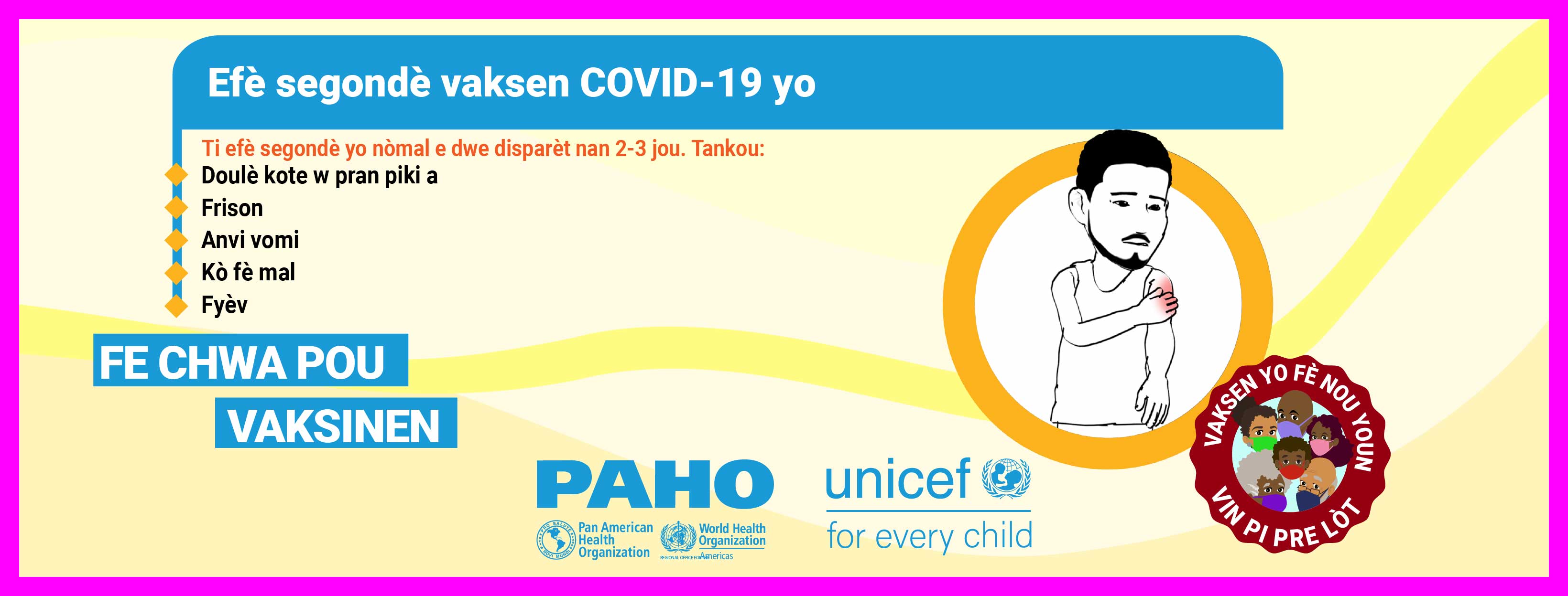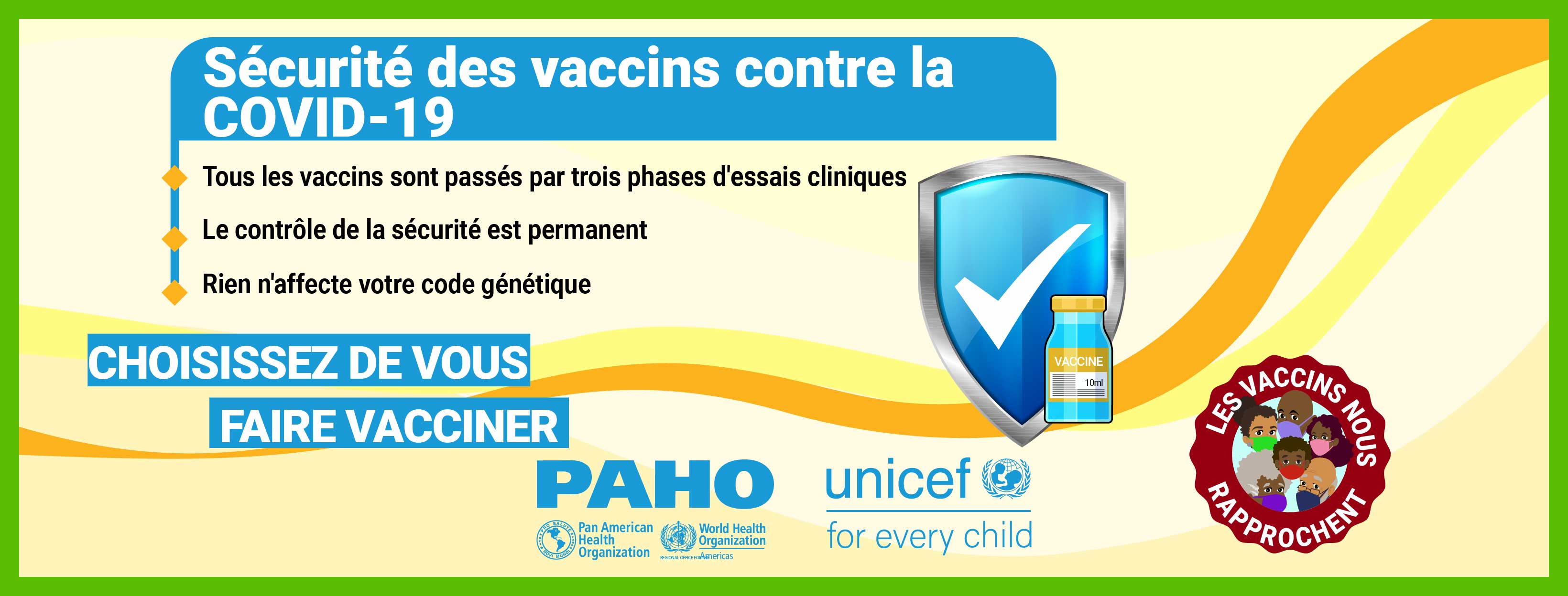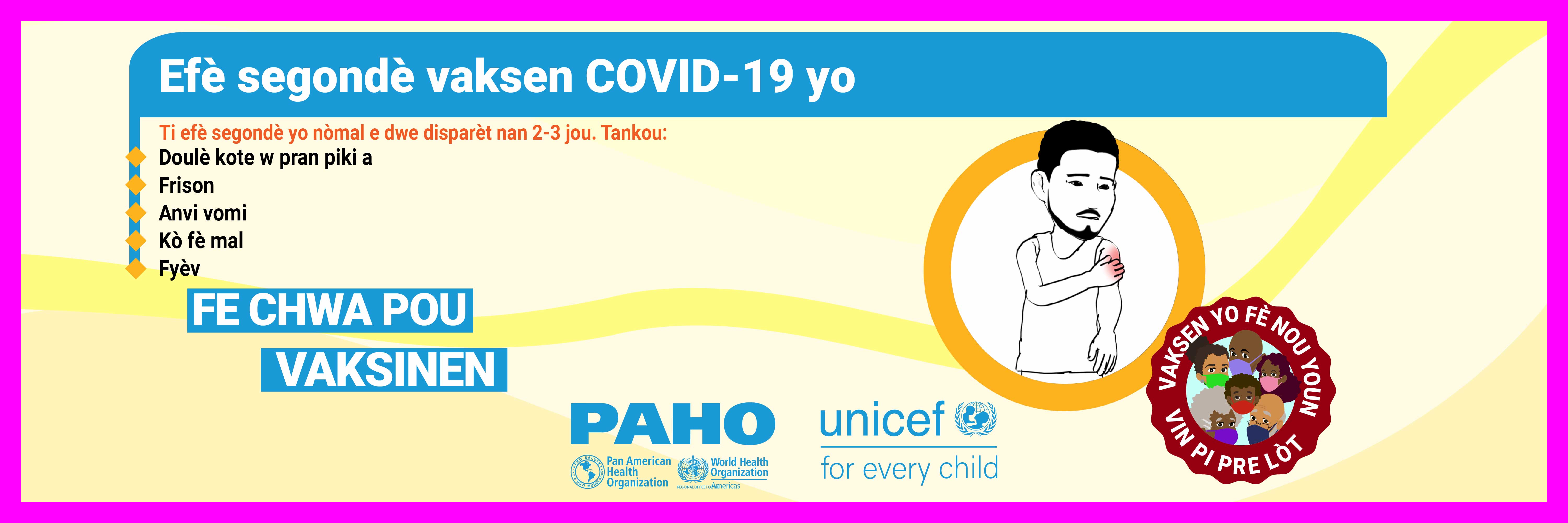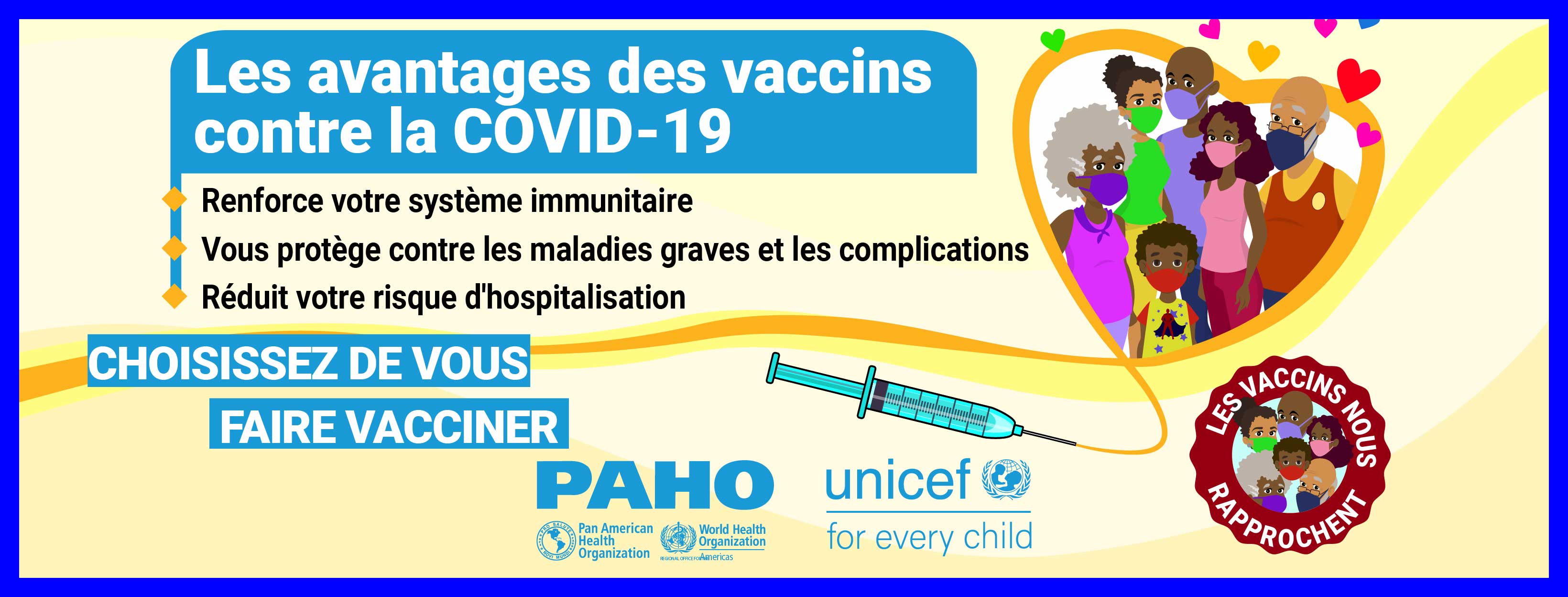 Dans la plupart des pays, les vaccins ne sont pas obligatoires et, par conséquent, la volonté du public de se faire vacciner contre le COVID-19 est une priorité élevée pour atteindre l'objectif d'immunité collective. Alors que nous cherchons à remédier à la vacillation vaccinale liée aux vaccins COVID-19 dans les Caraïbes et conformément à la demande formulée par certains États membres, l'Organisation panaméricaine de la santé (OPS) en collaboration avec le Fonds d'urgence des Nations Unies pour l'enfance (UNICEF) a développé des supports de communication pour combler certaines des lacunes dans les connaissances et les préoccupations concernant les vaccins COVID-19. Publiés le 21 mai 2021, ces supports de communication comprennent des vidéos, des cartes de réseaux sociaux et des annonces à la radio de service public. Les principaux sujets abordés sont: