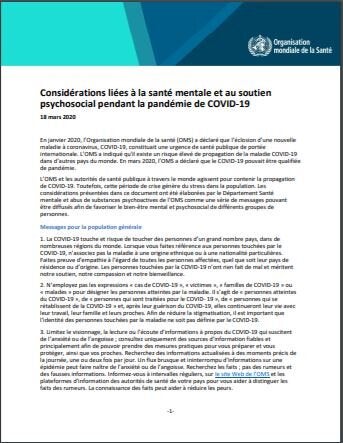 En janvier 2020, l’Organisation mondiale de la santé (OMS) a déclaré que l’éclosion d'une nouvelle maladie à coronavirus, COVID-19, constituait une urgence de santé publique de portée internationale. L’OMS a indiqué qu'il existe un risque élevé de propagation de la maladie COVID-19 dans d’autres pays du monde. En mars 2020, l’OMS a déclaré que le COVID-19 pouvait être qualifiée de pandémie. L’OMS et les autorités de santé publique à travers le monde agissent pour contenir la propagation de COVID-19. Toutefois, cette période de crise génère du stress dans la population. Les considérations présentées dans ce document ont été élaborées par le Département Santé mentale et abus de substances psychoactives de l'OMS comme une série de messages pouvant être diffusés afin de favoriser le bien-être mental et psychosocial de différents groupes de personnes.