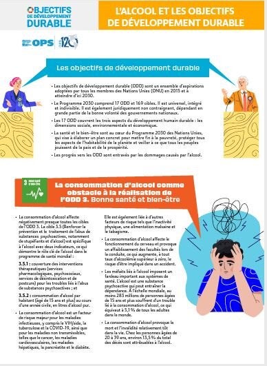 Les objectifs de développement durable (ODD) sont un ensemble d'aspirations adoptées par tous les membres de l'Organisation des Nations Unies en 2015 et à atteindre d'ici 2030. L'alcool affecte négativement plusieurs ODD, en plus de l'objectif de santé. Cette fiche décrira les liens entre l'alcool et le développement durable. L'objectif est de clarifier et de renforcer la nécessité d'une approche gouvernementale globale de la politique en matière d'alcool, afin de parvenir à un développement sanitaire, social et durable. La production et la consommation d'alcool sont liées à des problèmes de santé, à des inégalités et constituent un frein au développement durable. Il est nécessaire d'élargir la compréhension du public sur ces questions afin qu'il puisse soutenir et défendre des changements de politique en matière d'alcool qui profiteront à sa vie et à un mode de vie sain. Cependant, les partenariats avec l'industrie de l'alcool (producteurs d'alcool et leurs groupes de façade) peuvent menacer l'Agenda 2030, car ils ont un conflit d'intérêts inhérent avec les objectifs de santé publique et ceux de développement durable.