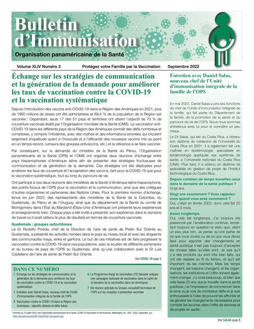 DANS CE NUMÉRO: Échange sur les stratégies de communication et la génération de la demande pour améliorer les taux de vaccination contre la COVID-19 et la vaccination systématique | Entretien avec Daniel Salas, nouveau chef de l’Unité d'immunisation intégrale de la famille de l’OPS | Vaccination contre la COVID-19 dans la Région des Amériques : objectifs atteints et défis futurs | Le Programme élargi de vaccination d’El Salvador prépare une campagne nationale de vaccination dans le cadre de la Semaine de la vaccination dans les Amériques | IXe réunion spéciale du Groupe consultatif technique de l'OPS sur les maladies à prévention vaccinale.
