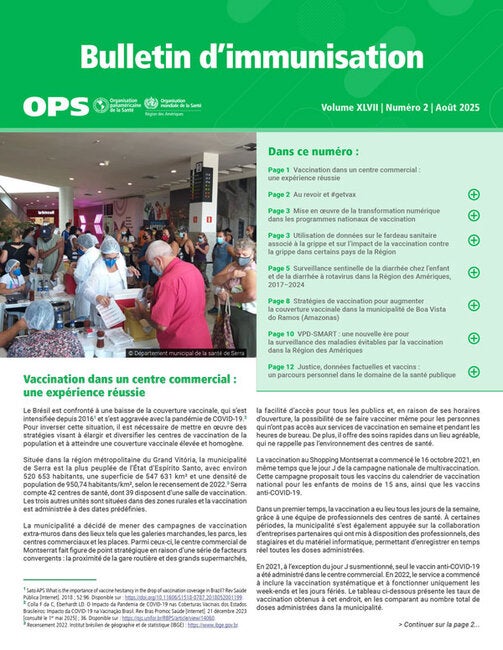 L'OPS publie quatre fois par an le Bulletin d'immunisation en anglais, français, portugais et espagnol. Son objectif est de faciliter l'échange d'idées et d'informations sur les programmes de vaccination dans la région des Amériques et au-delà. Les versions anglaise et espagnole sont publiées depuis 1979, tandis que les versions française et portugaise le sont depuis 2001 et 2019, respectivement. Le numéro d'août 2025 du Bulletin d'immunisation comprend les articles suivants : La vaccination dans les centres commerciaux au Brésil : une expérience réussie pour atteindre une couverture vaccinale élevée et homogène de la population ; Favoriser la transformation numérique des programmes de vaccination grâce à un nouveau cours virtuel sur les registres électroniques de vaccination (REV) dans le Campus virtuel de santé publique de l'OPS ; Utilisation des données sur la charge sanitaire liée à la grippe et l'impact de la vaccination contre la grippe dans certains pays de la Région, avec des informations sur un atelier visant à générer des données probantes à l'appui des politiques de santé pour la prévention et le contrôle de la grippe saisonnière ; Surveillance sentinelle de la diarrhée infantile et de la diarrhée à rotavirus dans la région des Amériques, de 2017 à 2024 ; Stratégies de vaccination pour augmenter la couverture vaccinale dans la municipalité de Boa Vista Do Ramos, Amazonas, au Brésil ; VPD-SMART : une nouvelle ère pour la surveillance des maladies évitables par la vaccination dans les Amériques ; Justice, preuves et vaccins : un parcours personnel dans le domaine de la santé publique, par Hugo Rázuri, directeur adjoint du Programme spécial d'immunisation intégrée (CIM) de l'OPS ; et un message d'adieu de la rédactrice en chef adjointe du Bulletin d'immunisation depuis 12 ans, Octavia Silva.