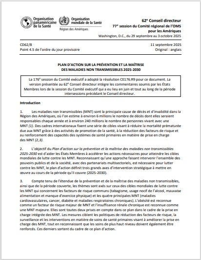 PrésentationLes maladies non transmissibles (MNT) sont la principale cause de décès et d’invalidité dans la Région des Amériques, où l’on estime à environ 6 millions le nombre de décès dont elles seraient responsables chaque année et à environ 240 millions le nombre de personnes vivant avec une MNT. Des cadres internationaux fixent une série de cibles visant à réduire la mortalité prématurée due aux MNT grâce à des activités de promotion de la santé, à la réduction des facteurs de risque et au renforcement des capacités des systèmes de santé primaires en matière de prise en charge des MNT. L’objectif du Plan d’action sur la prévention et la maîtrise des maladies non transmissibles 2025-2030 est d’aider les États Membres à accélérer les actions nécessaires pour atteindre les cibles mondiales de lutte contre les MNT. Reconnaissant qu’une approche faisant intervenir l’ensemble des pouvoirs publics et de la société, avec des partenariats multisectoriels, est nécessaire pour lutter contre les MNT, le plan d’action définit trois grands axes d’intervention stratégique à mettre en œuvre au cours de la période qu’il couvre (2025-2030). Compte tenu de l’étendue de la prévention et de la maîtrise des maladies non transmissibles, ainsi que de la période couverte, les thèmes sont axés sur ceux des cibles mondiales de lutte contre les MNT qui concernent les facteurs de risque communs (tabagisme, usage nocif de l’alcool, mauvaise alimentation et manque d’exercice physique) et les quatre principales MNT (maladies cardiovasculaires, cancer, diabète et maladies respiratoires chroniques). L’obésité est reconnue comme un facteur de risque majeur de MNT et l’insuffisance rénale chronique est reconnue comme une MNT majeure. Elles sont toutes deux prises en compte dans ce plan dans le cadre de la prise en charge intégrée des MNT. Les mesures ciblent les politiques de réduction des facteurs de risque, la surveillance et les interventions en matière de soins de santé primaires visant à améliorer la prise en charge des MNT, tout en reconnaissant que les soins de plus haut niveau doivent également être renforcés. Ces derniers sortent du cadre de ce plan d’action. Liens associés |