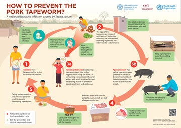 Téniase. Les ténias vivent dans l’intestin des êtres humains. Les œufs du ténia sont libérés avec les matières fécales. En cas de défécation à l’air libre, l'environnement (en particulier les légumes et l'eau) peut être contaminé. Cysticercose humaine. L'ingestion d'œufs de ténia (due à une mauvaise hygiène après l'utilisation des toilettes ou à la consommation d'eau ou d'aliments contaminés), entraîne le développement de kystes parasitaires principalement dans le cerveau (provoquant notamment des crises d’épilepsie). Cysticercose porcine. Les porcs mangeant des œufs de ténia (présents dans les matières fécales ou l'environnement) développent des kystes parasitaires principalement dans les muscles (viande). La viande infectée contient des kystes parasitaires qui ne sont pas toujours faciles à voir. La consommation de viande de porc infectée, crue ou mal cuite, entraîne le développement du ténia.
