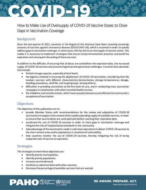 Depuis le dernier trimestre de 2021, les pays de la Région des Amériques reçoivent de plus en plus de vaccins COVID-19, ce qui a été déterminant pour combler rapidement les lacunes de la couverture vaccinale. Cependant, cette situation a, dans certains cas, conduit à une augmentation significative des stocks de vaccins. Cette publication fournit aux pays des recommandations pour revoir et adapter les stratégies de vaccination COVID-19 afin de s'assurer que les doses sont utilisées de manière optimale avant d'atteindre leur date de péremption. Il vise également à contribuer à combler les lacunes en matière de couverture vaccinale, à atténuer les risques d'hospitalisation et de mortalité, et à tirer parti des investissements dans la chaîne du froid pour atteindre les zones reculées et les populations vulnérables.