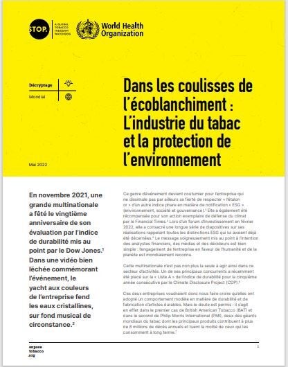 Les grandes compagnies de tabac ont été félicitées pour leur engagement envers la durabilité, malgré le fait que chaque étape de la production de cigarettes a un impact néfaste sur l'environnement. Alors, comment les entreprises peuvent-elles se présenter comme des intendants de l'environnement ? STOP s'est associé à l'OMS et au Secrétariat de la CCLAT pour dénoncer le greenwashing, la tactique de désinformation utilisée par les organisations pour présenter une image respectueuse de l'environnement. Lisez le résumé ou regardez le webinaire pour en savoir plus. Journée mondiale sans tabac 2022 - Il empoisonne notre planète |