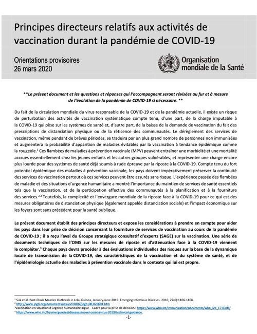Le présent document établit des principes directeurs et expose les considérations à prendre en compte pour aider les pays dans leurprise de décision concernant la fourniture de services de vaccination au cours de la pandémie deCOVID-19; il a reçu l’aval du Groupe stratégique consultatif d’experts (SAGE) sur la vaccination. Une série de documents techniques de l’OMS sur les mesures de riposte et d’atténuation face à la COVID-19 viennent lecompléter. Chaque pays devra procéder à des évaluations individuelles des risques sur la base de la dynamique locale de transmission de laCOVID-19, des caractéristiques de la vaccination et du système de santé, et de l’épidémiologie actuelle des maladies à prévention vaccinale dans le contexte qui lui est propre.