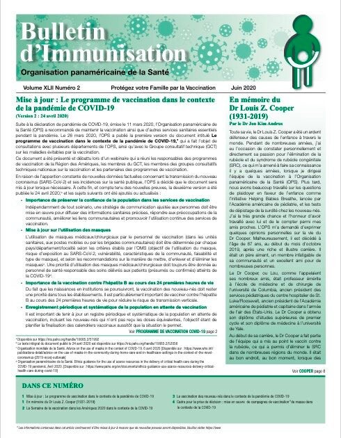 Dans ce numéro: Mise à jour : Le programme de vaccination dans le contexte de la pandémie de COVID-19 | En mémoire du Dr Louis Z. Cooper (1931-2019) | La Semaine de la vaccination dans les Amériques 2020 dans le contexte de la COVID-19 | La vaccination des nouveau-nés dans le contexte de la pandémie de COVID-19 | Cadre pour la prise de décision : mise en oeuvre de campagnes de vaccination Pde masse dans le contexte de la COVID-19