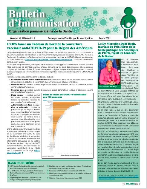 Dans ce numéro : L’OPS lance un Tableau de bord de la couverture vaccinale anti-COVID-19 pour la Région des Amériques | Le Dr Merceline Dahl-Regis, lauréate du Prix Héros de la Santé publique des Amériques de l’OPS, reçoit les honneurs de la Reine | Programme pour la vaccination à l’horizon 2030. Une stratégie mondiale pour ne laisser personne de côté | Stratégies pour promouvoir l’équité vaccinale : résumé d’études de cas menées en Guyana, Colombie et au Bolivie | Ressources de l’OPS/OMS sur la vaccination anti-COVID-19 | Réunion du Groupe consultatif technique sur les maladies évitables par la vaccination de l’OPS | Classement final des cas, Région des Amériques, 2020