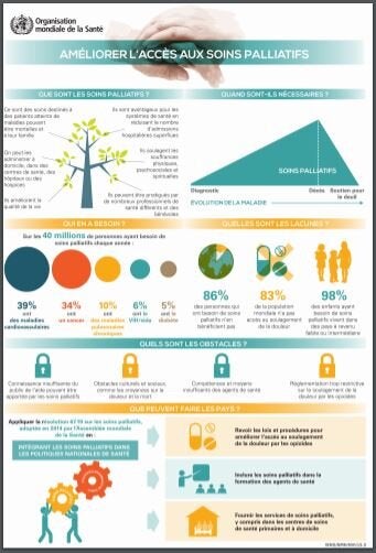 Cette infographie fournit des informations simples sur les soins palliatifs, qui en a besoin et quand, les lacunes et les défis, et ce que les pays peuvent faire pour améliorer l'accès aux soins palliatifs.