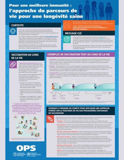 Le monde a subi une profonde transition démographique : aujourd'hui les personnes âgées de plus de 65 ans sont plus nombreuses que les enfants de moins de 5 ans, mais la qualité de vie ne s'améliore pas en conséquence. Avec l’âge, le système immunitaire s’affaiblit (immunosénescence), ce qui expose l’organisme à des maladies contre lesquelles il avait auparavant acquis une immunité. De plus, les maladies chroniques exacerbent les problèmes de santé lorsqu’elles sont associées à des infections survenant plus tard dans la vie. Dans la Région des Amériques, de nombreuses occasions ont été ratées qui auraient permis aux personnes de pleinement bénéficier des vaccins à toutes les étapes de la vie. Documents connexes:
