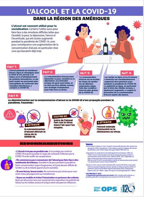 Cette fiche d’information met en évidence la relation entre la consommation d’alcool et la COVID-19. La consommation épisodique excessive d’alcool est considérée comme un risque pour la santé liée à la COVID-19, et l’alcool est utilisé par certains pour faire face aux émotions difficiles qui ont augmenté pendant la pandémie. En plus de décrire pourquoi l’alcool ne devrait pas être utilisé comme mécanisme d’adaptation pour faire face au stress, la fiche d’information aborde la désinformation sur l’alcool en relation avec la COVID-19 et fournit des recommandations sur la consommation d’alcool pendant la pandémie.