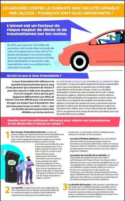 L’alcool est un facteur de risque majeur de décès et de traumatismes sur les routes. Les mesures contre la conduite avec facultés affaiblies par l’alcool sont importantes pour réduire l'usage nocif de l'alcool. Cette fiche d'information décrit différentes options politiques efficaces pour réduire les traumatismes et les décès liés à l’alcool au volant.